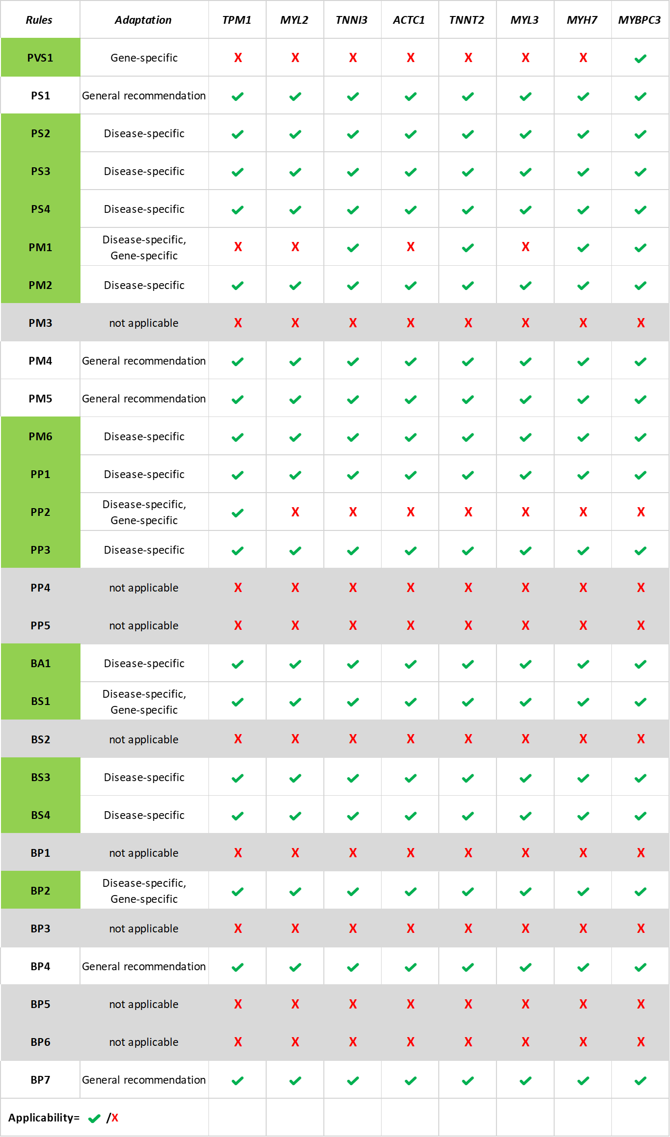 We grouped the criteria into nine evidence topics (population frequency (PM2, BA1, BS1), variant type (PVS1, PM4, PP2, BP7), in silico prediction (PP3, BP4), prevalence (PS4), mutational hotspots (PM1, PS1, PM5), functional effect (PS3, BS3), allelic origin (PS2, PM6), segregation (PP1, BS4), and co-occurrence (BP2)) where each one triggers the corresponding criteria based on ClinGen Cardiomyopathy VCEP specifications.